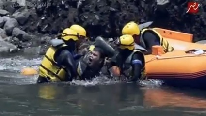 وعقب سقوط أحمد فتحى فى مياه رامز فى الشلال، فزع بشدة وظل يصرخ فى رعب وهو يصارع الأمواج، ونزل فريق من الإنقاذ من ضمنهم رامز جلال المتخفى ووضعوه في الزودياك، وسط صرخات من فتحى، بعدها قرأ فتحى الشهادة، وظل الزودياك يرتطم بشدة فى الصخور مع تألم فتحى، وبعدما رسو على الشاطئ تفاجأ بالغوريلا تخرج من بين الأشجار ويتنكر بداخلها رامز جلال، وفع فتحى وظل يردد الشهادة ، وبعدما كشف رامز عن نفسه انهار فتحى وقال له فى عصبية: "الطم على وشى .. هو انت مش انسان".