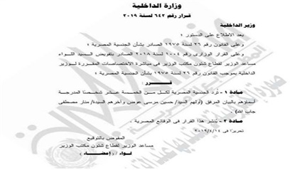 جاء ذلك بقرار الوزير الذي حمل رقم 642 لسنة 2019 ونشرته الجريدة الرسمية صباح اليوم.