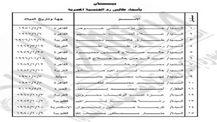 وجاء نص القرار: ترد الجنسية المصرية لكل من الخمسة عشر شخصا المندرجة أسماؤهم بالبيان المرفق، أولهم حسين مرسي عوض وآخرهم منار مصطفى جاب الله.
