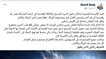 وقال النائب شريف نادي عبر بيان على صفحته الشخصية على موقع التواصل الاجتماعى "فيس بوك"، تعيد الكنيسة المصرية بتذكار دخول السيد المسيح والعائلة المقدسة إلى أرضنا المباركة مصر، لم يقصدوا أي بلد آخر ينشدون الأمان فيه ويمنحونه البركة، فقط مصر أرض البركة والأمان، ولعل هذه المعانى تحتاج إلى تكريس وطنى.