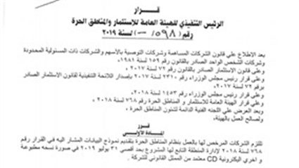 في إطار جهود وزارة الاستثمار والتعاون الدولي للتيسير على المستثمرين، و سعي الهيئة العامة للاستثمار والمناطق الحرة العمل على تبسيط الإجراءات على المستثمرين وتقديم خدمات متميزة؛ أصدرت الهيئة العامة للاستثمار والمناطق الحرة القرار رقم (٥٩٨)لسنة 2019.