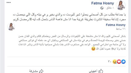 وطالبت من الجميع أن يشارك رسالتها التي ترد بها على شائعة وفاة حسن حسني، على جميع الصفحات، وقالت: "يا جماعة بطلب من كل أصحابي يعملوا شير للبوست ده والدي بخير و في بيته وكل اللي بيحصل ده مجرد إشاعة سخيفة انتشرت بطريقة غريبة جدا انا مش فاهمة الناس بتعمل كده ليه !! رمضان كريم".