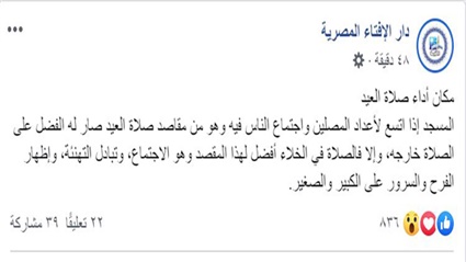 وأضافت دار الإفتاء المصرية، أنه إن لم يكن المسجد يتسع لأعداد المصلين، تكون الصلاة في الخلاء أفضل لهذا المقصد وهو الاجتماع، وتبادل التهنئة، وإظهار الفرح والسرور على الكبير والصغير.