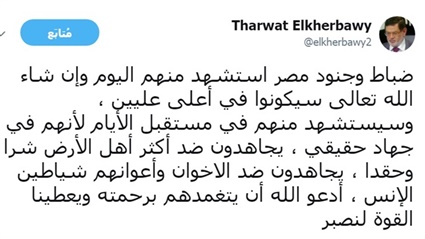 وكتب الخرباوى عبر تصفحته على موقع التدوينات القصيرة تويتر: "ضباط وجنود مصر استشهد منهم اليوم وإن شاء الله تعالى سيكونوا في أعلى عليين ، وسيستشهد منهم في مستقبل الأيام لأنهم في جهاد حقيقي، يجاهدون ضد أكثر أهل الأرض شرا وحقدا ، يجاهدون ضد الاخوان وأعوانهم شياطين الإنس ، أدعو الله أن يتغمضهم برحمته ويعطينا القوة لنصبر".