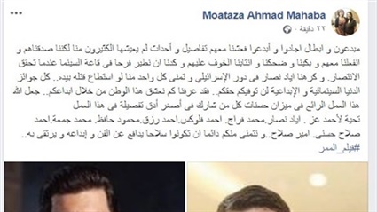 واضافت: "كرهنا إياد نصار فى دور الإسرائيلي وتمنى كل واحد منا لو استطاع قتله بيده.. كل جوائز الدنيا السينمائية و الإبداعية لن توفيكم حقكم.. فقد عرفنا كم نعشق هذا الوطن من خلال ابداعكم.. جعل الله هذا العمل الرائع فى ميزان حسنات كل من شارك فى أصغر أدق تفصيله في هذا العمل، تحية لأحمد عز، إياد نصار، محمد فراج، أحمد فلوكس، أحمد رزق، محمود حافظ، محمد جمعة، أحمد صلاح حسنى، امير صلاح، ونتمنى منكم دائما ان تكونوا سلاحا يدافع عن الفن و إبداعه و يرتقى به.. فيلم الممر".