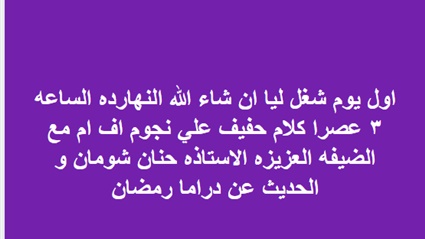 وكتب شريف مدكور عبر حسابه الشخصي بموقع التواصل الإجتماعي فيسبوك: "اول يوم شغل ليا ان شاء الله النهارده الساعه ٣ عصرا كلام حفيف علي نجوم اف ام مع الضيفة العزيزة الاستاذة حنان شومان و الحديث عن دراما رمضان".