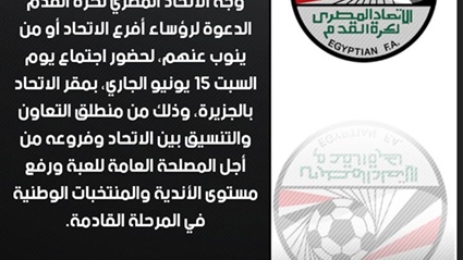 وجه الاتحاد المصري لكرة القدم الدعوة لرؤساء أفرع الاتحاد أو من ينوب عنهم، لحضور اجتماع يوم السبت المقبل، بمقر الاتحاد بالجزيرة، من منطلق التعاون والتنسيق بين الاتحاد وفروعه من أجل المصلحة العامة للعبة ورفع مستوى الأندية والمنتخبات الوطنية في المرحلة القادمة.