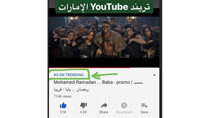تصدر برومو أغنية بابا للفنان محمد رمضان، التريند في اليوتيوب بجمييع الدول العربية، حيث أن محمد رمضان بابا أحتلت المرتبة الأولى في قائمة التريند على اليوتيوب بمصر وليبيا، وفي الكويت وتونس حصلت محمد رمضان بابا على المركز الثانى، كما أنه حصل على المركز الرابع في الإمارات وجاء فى المركز السادس فى السعودية، كما حصل محمد رمضان بابا على المركز التاسع فى المغرب.