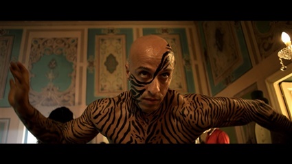 هناك أكثر من عالم في الفيلم، ولكن أكثرهم إثارة للفضول هو العالم الغرائبي المليء بالملوك والملكات والعروض الراقصة الصاخبة والبدائية أيضاً.