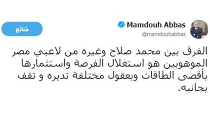 وغرد عباس عبر الحساب الرسمي له على "تويتر":"الفرق بين محمد صلاح وغيره من لاعبي مصر الموهوبين هو استغلال الفرصة واستثمارها بأقصى الطاقات وبعقول مختلفة تديره وتقف بجانبه".
