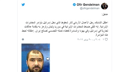 وقال أوفير جندلمان المتحدث باسم رئيس الوزراء الإسرائيلي، على "تويتر": "اعتقل الشاباك رجل الأعمال الأردني ثائر شعفوط الذي دخل إسرائيل بأوامر المخابرات الإيرانية".
