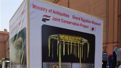 ومن جانبه، أوضح الطيب عباس مدير الشؤون الأثرية بالمتحف المصري الكبير، أن مظلة الملك توت عنخ آمون هي أخر قطعة أثرية يتم نقلها ضمن المشروع المصري الياباني المشترك لنقل عدد 72 قطعة أثرية من المتحف المصري بالتحرير الي المتحف المصري الكبير بدعم من مؤسسة الجايكا.