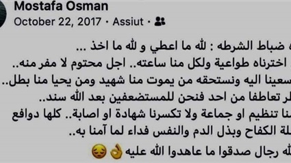 هذه كلمات نشرها على صفحته الشخصية على "فيسبوك" النقيب مصطفى عثمان أحد شهداء التصدي لمحاولات الهجوم الإرهابي على كمين العريش فجر اليوم.