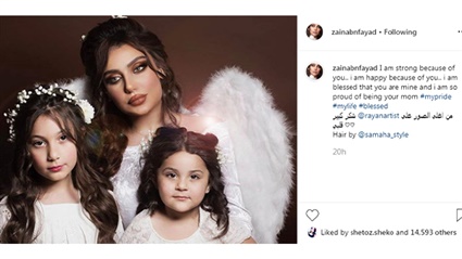 ونشرت زينب ابنة هيفاء وهبي أيضًا، صورة لها برفقة ابنتيها وظهرا بملابس بيضاء وعلى أكتافهن جناحات، وكتبت: "أنا قوية من أجلكن، وسعيدة بسببكن، وفخورة كوني والدتكن".