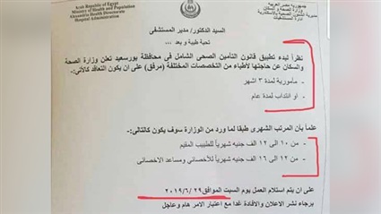 وأشارت "الصحة" في الخطاب أن المرتب طبقا لما ورد من الوزارة سيكون من 10- 12 ألف جنيه شهريًا للطبيب المقيم، ومن 12- 16 ألف جنيه للأخصائي ومساعد الأخصائي، على أن يتم استلام العمل يوم السبت الموافق29ـ6ـ2019.