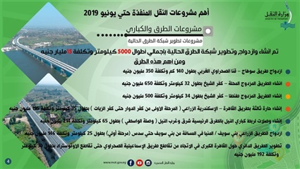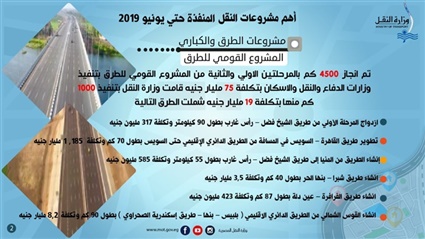 أعلنت وزارة النقل عن أهم مشروعات المنفذة حتى يونيو 2019 والتابعة لهيئة الطرق والكباري حيث تم انجاز 4500 كم بالمرحلتين الأولى والثانية من المشروع القومي للطرق بتنفيذ وزارات الدفاع والنقل والإسكان بتكلفة 75 مليار جنيه قامت وزارة النقل بتنفيذ 1000 كم منها بتكلفة 19 مليار جنيه شملت الطرق التالية: