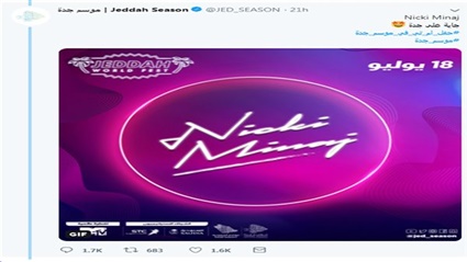 يبدو أن التطور الذي حدث في السعودية بإقامة الحفلات على أرضها اصبح أكثر انفتاحًا، وذلك بعد أن اعلنت الصفحة الرسمية لـ "موسم جدة"، أنها ستقيم حفل قريبًا على الأراضي السعودية للنجمة الأمريكية نيكي ميناج، مما آدى إلى تعجب وغضب الكثيرون.