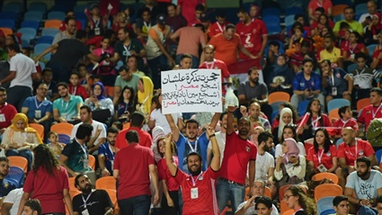 ورفع المشجع لافتة للاعبي منتخب مصر، قائلا، حجزت تذكرة علشان أشجع مصر، أشجع مين أنا دلوقتي؟، برضه هشجعك يامصر.
