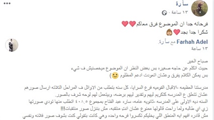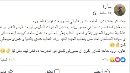 فيما علقت إحدى زميلات الطالبة بالمدرسة والمتضامنة معها، على الواقعة، قائلة: "مدرستنا العظيمة العريقة كلية الإقبال فرع السريا رفضت تحط صورة الأولى على المدرسة زي ما بتعمل كل سنة لمجرد إن البنت منتقبة، كل سنة بتطلب من الأوائل في المراحل الثلاثة إرسال صورهم علشان تتعلق على المدرسة كتكريم وتقدير لهم، وبيتعمل عمل لوحة شرف لهم بالصور، والسنة دي الأولي على المدرسة سارة عبد الفتاح بمجموع ٤٠٨.٥ واتطلب منها إنها ترسل صورتها زي أي طالبة ولما راحت قالولها ممنوع علشان انتي منتقبة مش بننزل صور منتقبات.. مش قادرة أفهم إيه المنطق اللي يخليكم تكسروا فرحة واحدة وهي كانت بتقولي كنت بشوف صور فلانة ونفسي أبقى زيها ويتحط صورتي!! هو ده التكريم منهم؟!".