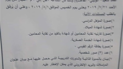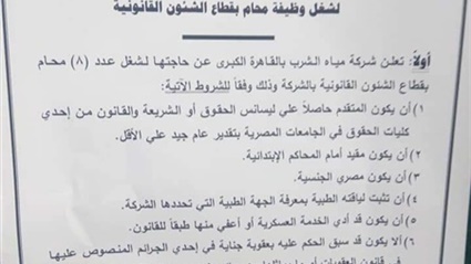 كما حددت الشركة عدة شروط لوظائف خالية من بينها، أن يكون مقيد أمام المحاكم الابتدائية، وأن يكون مصرى الجنسية، وأن تثبت لياقته الطبية، وأن يكون أدى الخدمة العسكرية أو أعفى منها، ألا يكون مفصول من خدمة بحكم نهائى أو بقرار تأديبى، وألا يكون قد سبق عليه بأحكام جنائية.