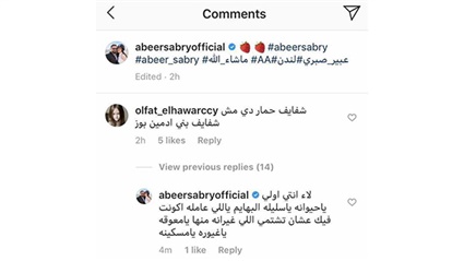 ونشرت عبير صبري صورة لها على "إنستجرام" من العاصمة البريطانية لندن وهي تأكل التوت"، لكنها تفاجأت بمتابعة لها تعلق على الصورة بألفاظ ساخرة منها، لترد عليها عبير صبرى بوابل من الشتائم.