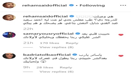 بينما كتب عدد من المشاهير تعليق على خبر وفاة ريهام سعيد، حيث كتبت سمر يسري: "حبيبت قلبي بعد الشر عليكي ربنا يحفظك ويخليكي لأولادك"، وكتبت بدرية طلبة: " ياساتر يارب بعدالشر حبيبتى ربنا يطول فى عمرك لاولادك ولحبايبك".
