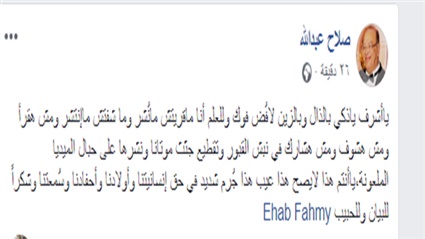ونشر الفنان صلاح عبد الله، عبر حسابه الرسمي على موقع التواصل الاجتماعي "فيس بوك"، قائلا ردا على البيان الذى نشره الفنان إيهاب فهمي، عضو نقابة المهن التمثيلية: "يا أشرف ياذكي بالذال وبالزين لافُض فوك وللعلم أنا ماقريتش مانُشر وما شفتش ما إنتشر ومش هقرأ ومش هشوف ومش هشارك في نبش القبور وتقطيع جثث موتانا ونشرها على حبال الميديا الملعونة".