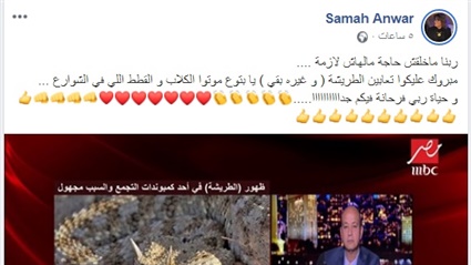 علقت الفنانة سماح أنور على ظهور أفعى "الطريشة"، وانتشارها في الفترة الأخيرة بالتجمع الخامس، والذي أدى إلى حالة من الذعر والرعب بين الأهالي، كما أنه جاءت تصريحات البعض بأن ظهور "الطريشة"، لقتل الكلاب والقطط الضالة المتواجدة بالشوارع.