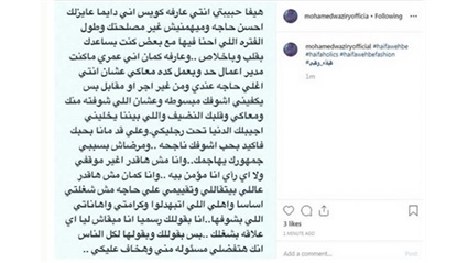 وكتب محمد وزيري، عبر حسابه على موقع تبادل الصور والفيديوهات الشهير إنستجرام: "هيفا حبيبتي أنتي عارفة كويس إني دايمًا عايزلك أحسن حاجة وميهمنيش غير مصلحتك، وطول الفترة اللي إحنا فيها مع بعض كنت بساعدك بقلب وإخلاص، وعارفة كمان إن عمري ما كنت مدير أعمال حد وبعمل كده معاكي عشان أنتِ أغلى حد عندي، ومن غير أجر أو مقابل بس يكفيني أشوفك مبسوطة وعشان اللي شوفته منك ومعاكي وقلبك النضيف، واللي بيننا يخليني أجيبلك الدنيا تحت رجليكي".