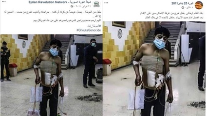وبالرجوع إلى أصل الصورة تبين أنها منشورة بعدة مواقع سورية لشهر فبراير 2018، وعلق البعض عليها قائلين:" طفل من الغوطة يحمل عوضَا أو كنبة.. جراحاته وأنابيب تخرج من جسده.. لا معين له إلًا الله..اللهم ارحم ضعفهم واجبر كسرهم وانصرهم على من عاداهم ونكل بهم".