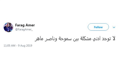 ونشر عامر على صفحته الرسمية بموقع التغريدات القصيرة "تويتر": "لا توجد أدني مشكلة بين سموحة وناصر ماهر".