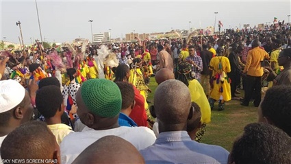 وتزينت ساحة الحرية منذ الصباح استعدادا لهذا اليوم الموعود، وحينما مالت شمس الظهيرة بدأت الساحة - على اتساعها - تضيق بالمواكب، نحاس ودفوف تخفق على وقعها القلوب ورقصات شعبية تمايلت معها النفوس، وردد الجميع السلام الوطني السوداني فتجاوبت معهم أرجاء الساحة.