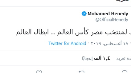 وغرد الفنان محمد هنيدي عبر حسابه الرسمي على موقع التدوينات القصيرة "تويتر" قائلا: مبروك لمنتخب مصر كأس العالم .. ابطال العالم".