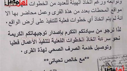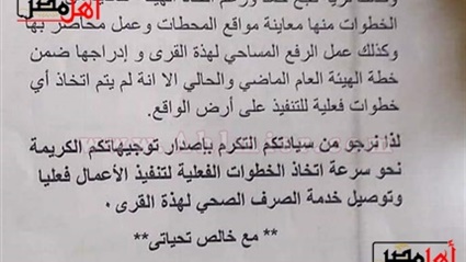 وكذلك عدم البدء الفعلي في تنفيذ مشروعات الصرف الصحي بقرى مجلس قروي الصوامعة غرب وتوابعها رغم تبرع أهالي بعض هذه القرى بالأرض اللازمة لإقامة محطات الرفع .