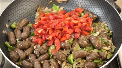 - وضع السجق ولكن دون أن تقطّعيه وقلّبيه وحرّكي المكوّنات مع بعضها.