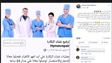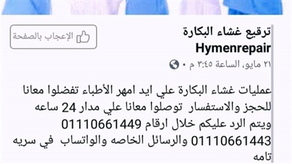 وجاء نص الإعلان كالتالي: " #مفاجأة_لكل_بنت، من النهاردة مفيش خوف، مفيش قلق تقدري تعيشي حياتك في مجتمعنا العربي الشرقي المفتوح بدون فزع أو تردد، عرض خاص وبسعر التكلفة، ترقيع غشاء البكارة على يد أمهر الأطباء المتخصصين وفي سرية تامة للحجز والاستعلام تواصلوا معنا على مدار ٢٤ ساعة".