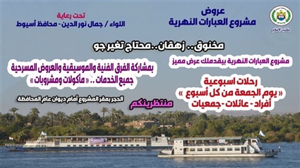 وأضاف هشام صلاح مدير مشروع العبارات النهرية بالمحافظة إنه تم الاعلان عن برامج وعروض للرحلات الأسبوعية والتي ستنطلق من ابتداءًا من الجمعة القادمة وبصفة أسبوعية وبمشاركة الفرق الفنية والموسيقية ومسرح العرائس للأطفال مع تقديم جميع الخدمات من "مأكولات ومشروبات" وذلك بهدف خلق متنفس جديد للأفراد والعائلات والجمعيات الأهلية لقضاء أوقات للفسحة على متن العبارات النهرية المختلفة من خلال رحلات داخلية نيلية لافتًا إلى إنه سيتم حجز الرحلات بمقر المشروع خلف مبنى المجلس الشعبي المحلي أمام مبنى ديوان عام المحافظة.