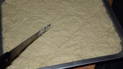 - ندهن الصينية بقليل من الزيت أو أي مادة دهنيّه، ثمّ نضع الخليط فيها ونبسطه ثم نضعها لترتاح حوالي خمس عشرة دقيقة قبل وضعها بالفرن.