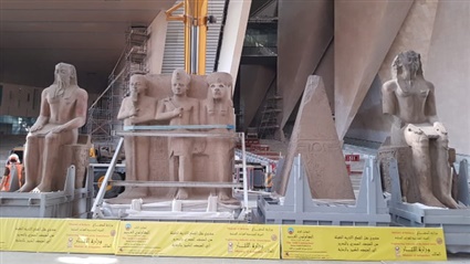 وقال الدكتور الطيب عباس مدير عام الشؤون الاثرية بالمتحف المصري الكبير، ان هذه القطع كانت معروضة بحديقة المتحف المصري بالتحرير و تشمل تمثالين من الجرانيت الوردي للملك سنوسرت الأول وثالوث للملك رمسيس الثاني والإله بتاع والمعبودة سخمت من الجرانيت الوردي، يبلغ وزنه ٢٠طن و رأس مسلة للملكة حتشبسوت من الجرانيت الأحمر نحت عليها ألقاب التتويج الخاصة بها و نقش يصور الآلة آمون، ويبلغ وزنها ١٤ طن.