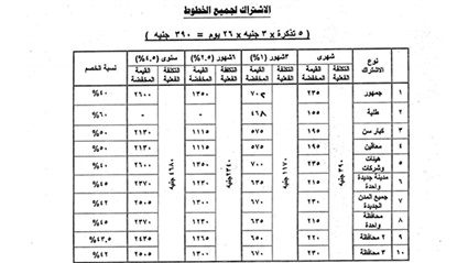 - الشهري بـ155 جنيهًا للطلبة وبـ 235 جنيهًا للجمهور وبــ195 جنيهًا لكبار السن والمعاقين.