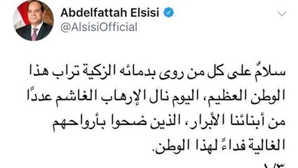 وقال الرئيس عبر صفحته الرسمية:" سلام على كل من روى بدائه الزكية تراب هذا الوطن العظيم، اليوم نال الإرهاب الغاشم عددا من ابنائنا الأبرار الذين ضحوا بأرواحهم الغاللية فداء لهذا الوطن".