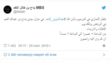 وأشار حساب بداح بن طلال الفغم، إلى أن "التعازي في المرحوم بأذن الله عبد العزيز الفغم تستقبل في منزل جدي بداح بن عبد الله الفغم في الرياض، وذلك يوم الثلاثاء والأربعاء من الساعة 5 عصرا إلى الساعة 9 مساء".