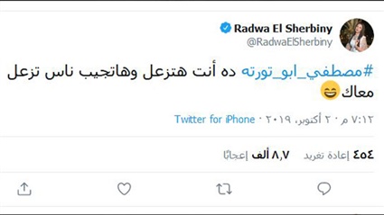 وقالت رضوى الشربيني، في تغريدتها على"تويتر": "#مصطفي_أبو_تورتة ده انت هتزعل وهتجيب ناس تزعل معاك"، ليسخر منها إبراهيم سعيد وتقوم بحظره بعد ذلك.