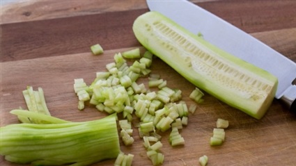-قومي بتقشير الخيار، وبعدها ابشري الخيار حتى تحصلي على رقائق صغيرة منه.