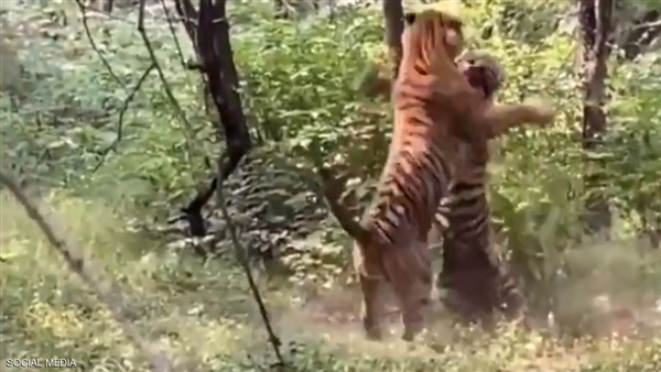 تداول نشطاء علي مواقع التواصل الإجتماعي فيديو يظهر شجار عنيف بين نمرين في إحدى الغابات الهندية، وقالت صحيفة "تايمز أوف إنديا" الهندية، أن المعركة التي وثقها عدد من السياح، جرت بين النمرين في المنتزه الوطني بمنطقة راجستان، شمالي البلد الآسيوي، وكان سبب المشاجرة "أنثى" وسط الغابة، لكن الأخيرة لاذت بالفرار بعدما اندلعت المواجهة بين المفترسين.