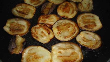 - تسخين الزيت حتى يكون جاهز للقلى، ضعى شرائح الباذنجان وتابعى تحميرها حتى تأخذ اللون الذهبى.