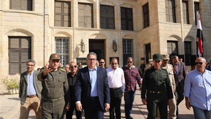 استهل وزير الآثار جولته بالمتحف الحربي حيث اطلع من اللواء اركان حرب عماد جاد مدير ادارة المتاحف العسكرية علي عرض لتصور مشروع تطوير المتحف والمنطقة المحيطة به وكيفية تحويل المناطق المفتوحة بها الي مزار سياحي به خدمات ومتنزهات للزائرين.