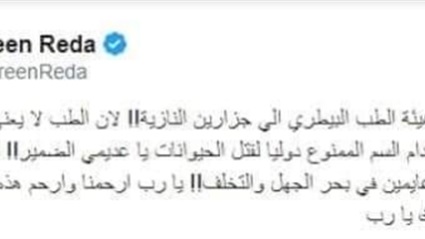 وكانت الفنانة شيرين رضا، هاجمت هيئة الطب البيطري، عبر حسابها الرسمي على موقع التدوينات القصيرة "تويتر"، ووصفتها بـ"جزارين النازية".