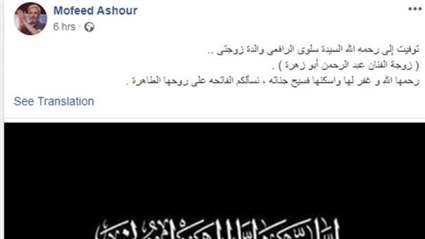 وقال "عاشور": "توفيت إلى رحمة الله السيدة سلوى الرافعى والدة زوجتى، (زوجة الفنان عبد الرحمن أبو زهرة)، رحمها الله وغفر لها وأسكنها فسيح جناته، نسألكم الفاتحة على روحها الطاهرة".