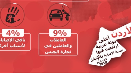 وأوضحت التقارير الإعلامية أن الوفيات الناجمة عن مرض الإيدز في الدول العربية أكثر ترجيحاً بسبب إحجام الأشخاص المعرضين لخطر الإصابة بفيروس نقص المناعة البشرية عن اجراء اختبارات تشخيص الإصابة، وسجل الأردن أعلى نسبة إصابة بالإيدز في الدول العربية في عام 2018.